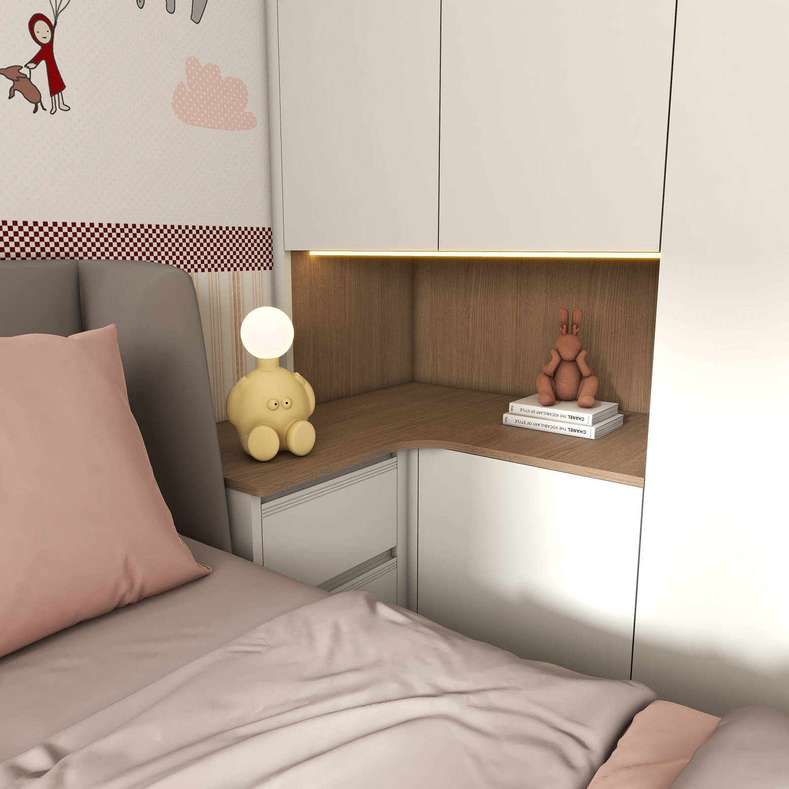 儿童房采用温柔的奶白作为空间底色,整墙卡通贴画搭配奶油白衣柜,在细节上用粉色装饰作为跳色,无形中增加立体感和层次感,营造出童真舒适的儿童梦中情房。